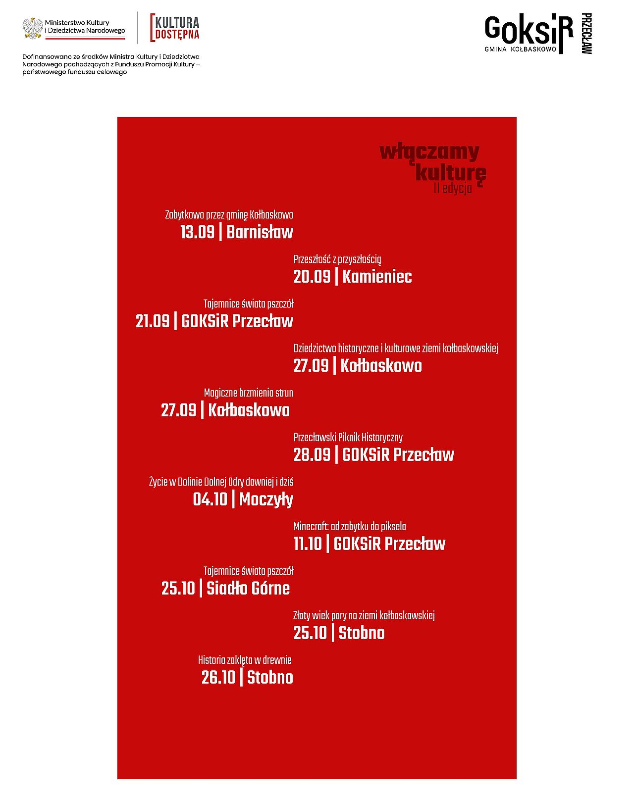 „Włączamy Kulturę – 2. edycja” to interdyscyplinarny projekt Gminnego Ośrodka Kultury, Sportu i Rekreacji w Przecławiu, realizowany w 2025 r. w sołectwach gminy Kołbaskowo w ramach programu „Kultura Dostępna”. Tegoroczną edycją kontynuujemy działania zainicjowane w 2024 r.