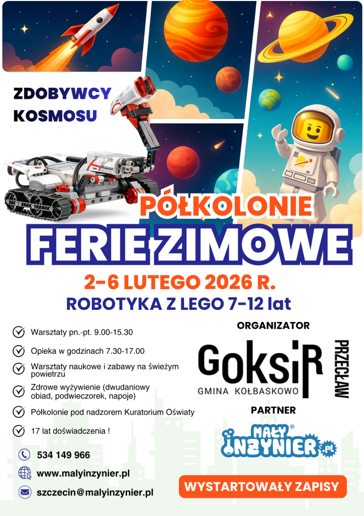 Zapraszamy dzieci 8–12 lat na zimową półkolonię z robotyką LEGO w GOKSiR Przecław! To idealna propozycja na ferie zimowe w Przecławiu dla młodych fanów klocków, technologii i kosmosu.